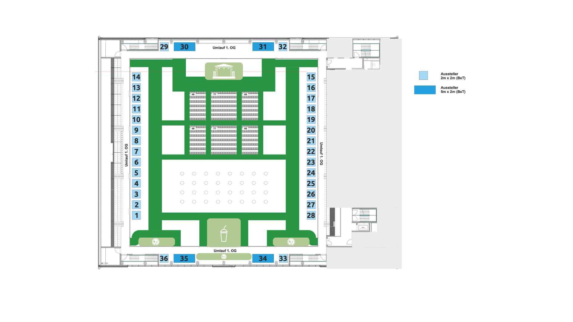 Stände 29–36 im oberen Umlauf mit exklusiver Sicht auf das Kongressgeschehen.